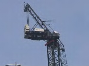 A crawler crane fell over during a storm and crushed three container offices on Monday.