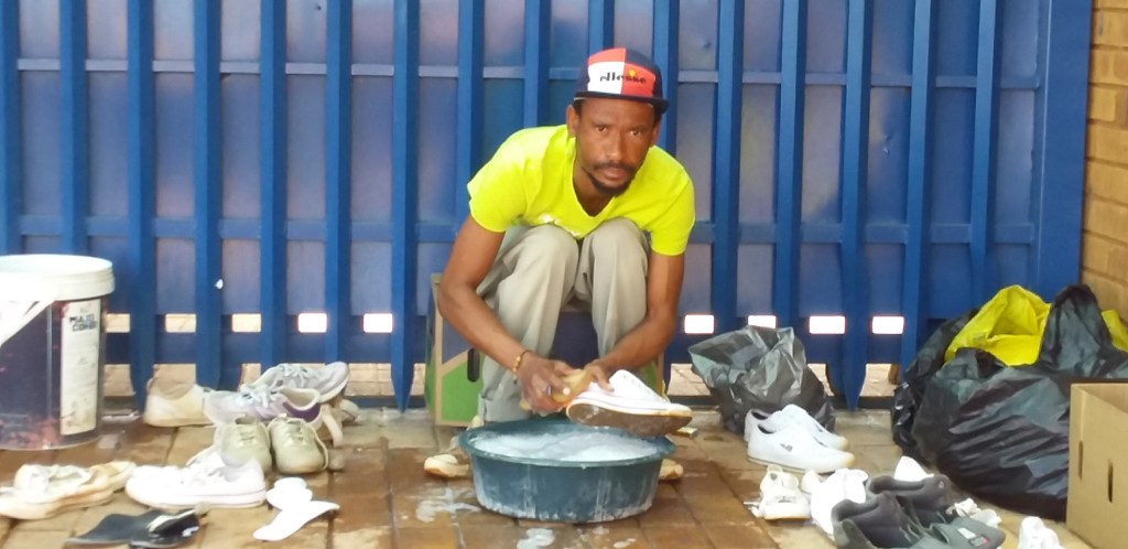 Picture: Katlego Setlhapelo (38) washing sneakers to earn a living