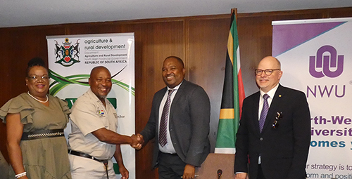 Picture: Dr Karabo Mabe, acting Chief Director for Agricultural Support Services at DARD, Thupi Mokhatla, Head of Agriculture and Rural Development for the North West DARD, Prof Bismark Tyobeka, NWU Principal and Vice-Chancellor and Prof Robert Balfour, Deputy Vice-Chancellor for Teaching and Learning at the NWU